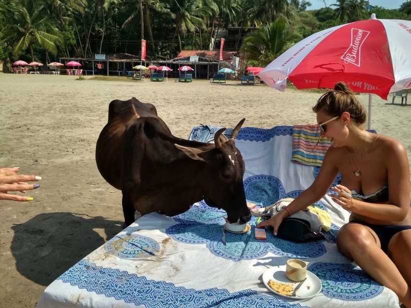 И совсем не похожи эти священные животные на наших молочных тучных телочек. Коров не убивают, и индусы говядину не едят. В меню говядину видела пару раз, однажды пробовали – ощущение, что коровка умерла собственной смертью, причем от старости – жесткое почти безвкусное мясо.