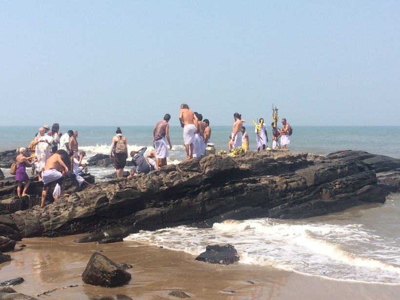 Еще один интересный ритуал, свидетелем которого я стала - подношение богу Шиве. На Вагаторе, где в камне высечена голова бога, застали процессию поклоняющихся с дарами - ветками бананов и бидонами молока. Познавательно.
