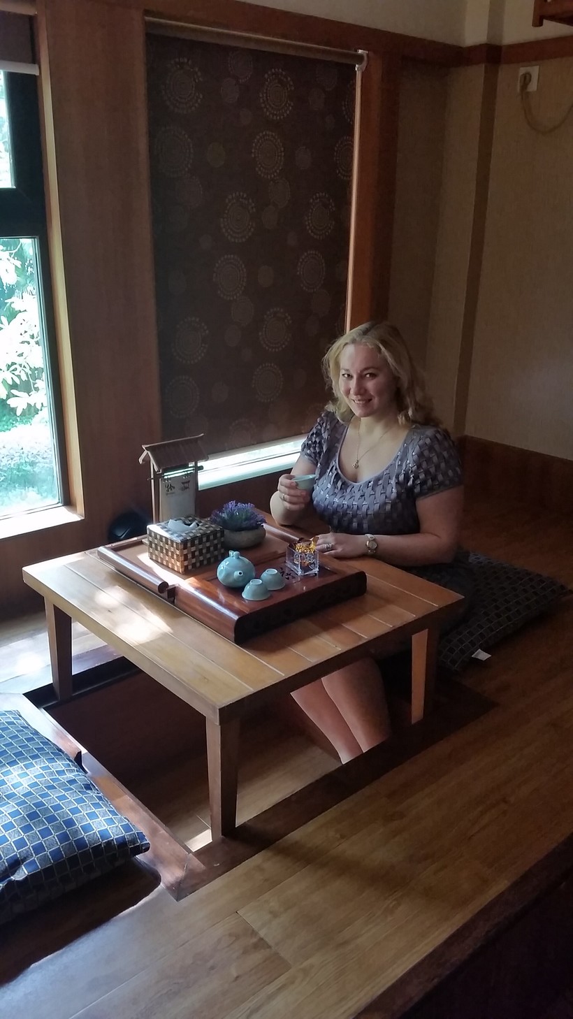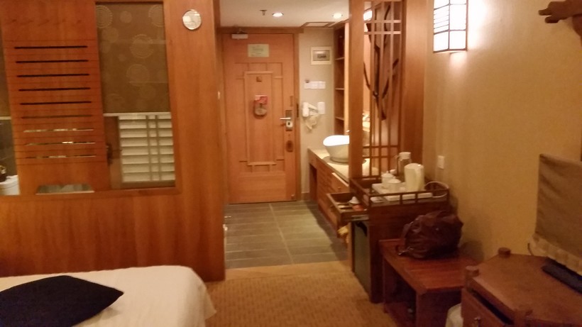 Раковина в номере расположена рядом с входной дверью. Как мне объяснили - это сделано по фэн-шуй, чтобы омывать руки и лицо при входе в помещение. Это связано с чистотой души и тела. Также в номере было всё для чайной церемонии: низкий столик, подушечки, настоящий листовой чай, который в Китае просто великолепен. Впрочем, для европейцев, у такого низкого столика есть углубление для ног, ведь правильно сложить ноги для чаепития без привычки очень сложно. Однако можно забронировать настоящий китайский номер, где вместо кровати посетителям предлагается спать на полу на циновке (я заглянула в один из таких номеров).