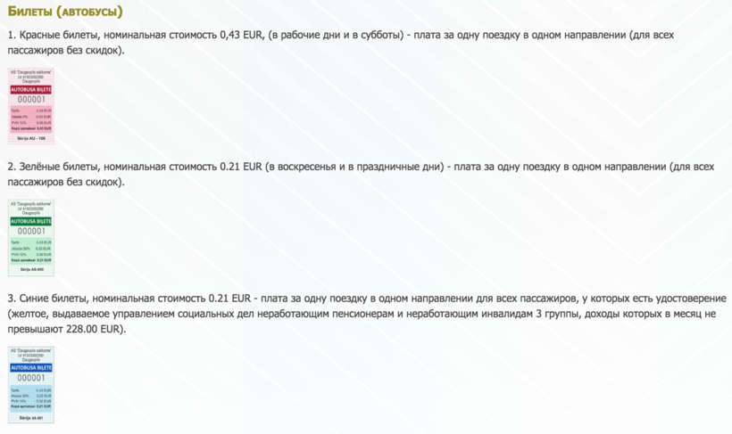 С другой стороны, Даугавпилс - достаточно крупный город, где трамваи курсируют по 3 маршрутам, автобусы - по 34. Билеты различаются по цветам и стоят от 0.21 евро (воскресные) до 0.43 евро (будничные) в один конец.