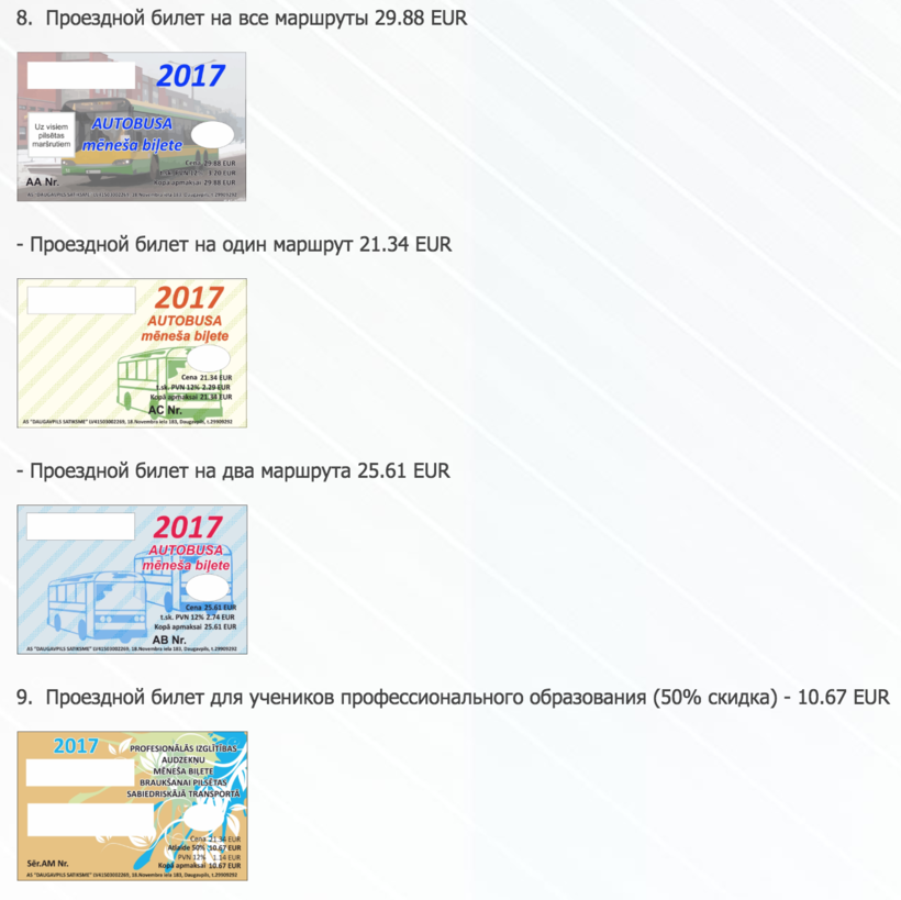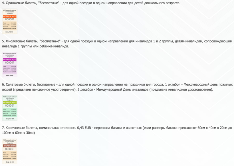 Групповые и временные билеты необходимо "загружать" на э-талоны - похожие на нашу "Тройку" карточки. Э-талоны бывают разных видов, подробно почитать про них можно здесь. Если вы хотите покататься на рижских минибусах (типа наших маршруток), то без такого талона не обойтись. А вот на экспрессах и ночных автобусах можно ездить по обычным билетам, стоимость которых указана на скриншоте выше. Расписание и маршруты таких видов наземного транспорта указано на вышеупомянутом сайте для гостей Риги.