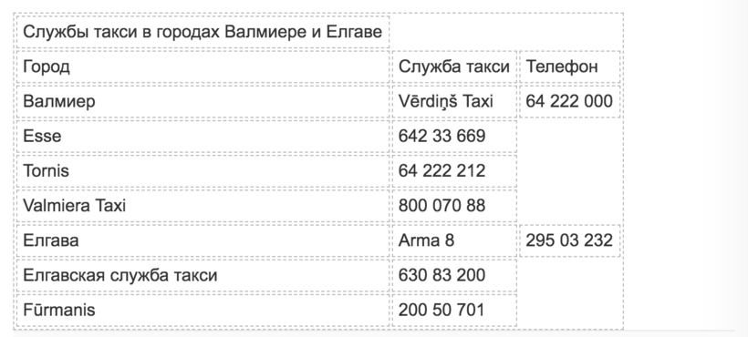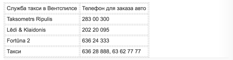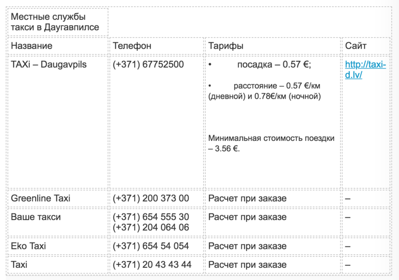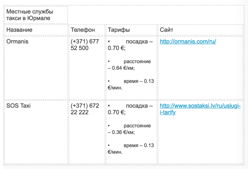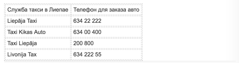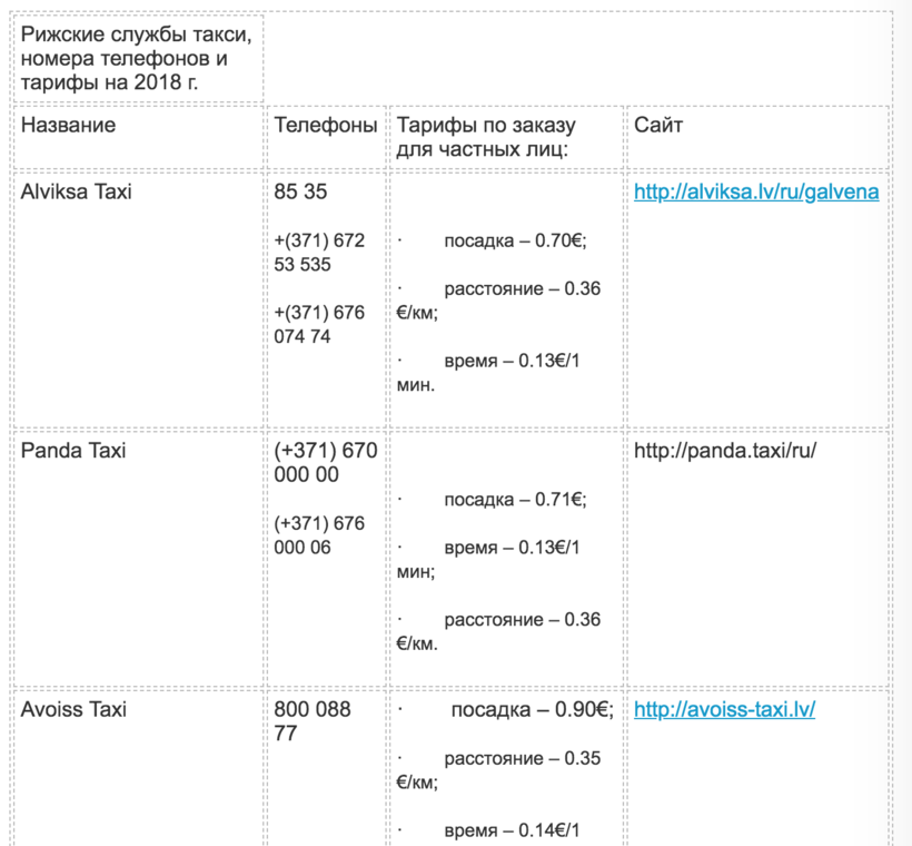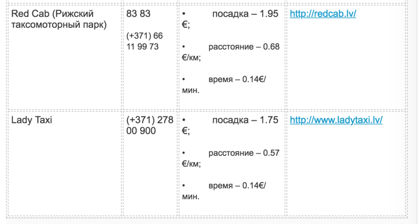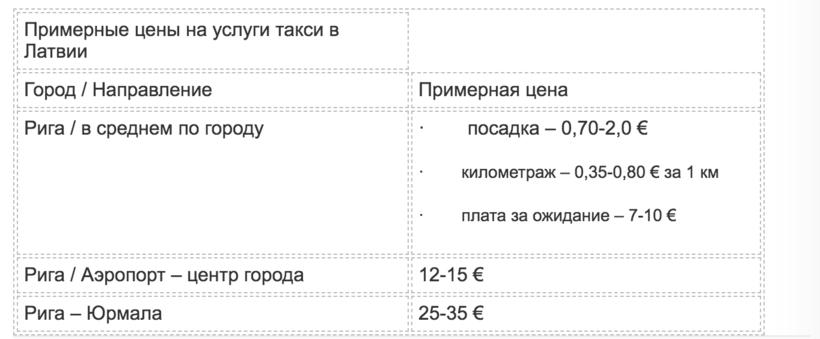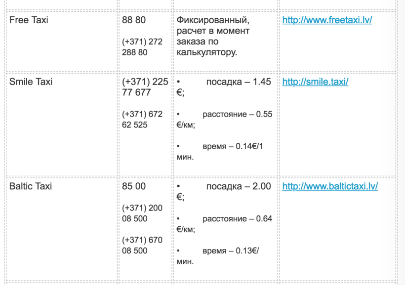 Ниже вы найдёте названия и телефоны операторов такси различных латвийских полисов, а также примерную стоимость поездок: