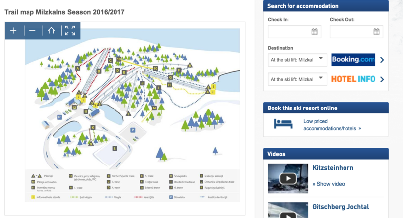 В Милжкалнсе, где минимальная высота - 75 метров, а максимальная - 110 метров, вы найдёте 1.6 км пист, а также 8 ски-лифтов и более 10 спусков. Однако, вход в этот парк, открытый с 9 утра до 11 ночи, обойдётся в 17 евро на человека. На территории есть гостиница и кафе, а также душевые.