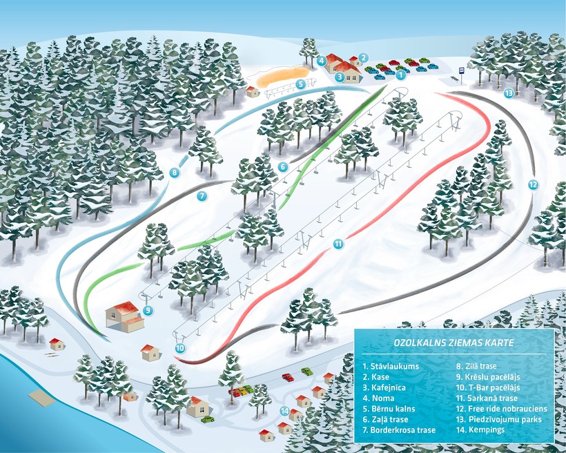 В Озолнкалнсе - самая развитая инфраструктура. Помимо кафе, бара и целого гостиничного комплекса с парковкой, тут даже кемпинг имеется. Я лично знаю смельчаков, которые зимой предпочитают жить на природе, так что может быть актуально. Кроме того, именно в Цесисе в зимнее время можно снять номер в гостинице или целый дом в любом удалении от курорта и не волноваться, поскольку к спускам курсируют автобусы - рейсовые и туристические (бесплатные).