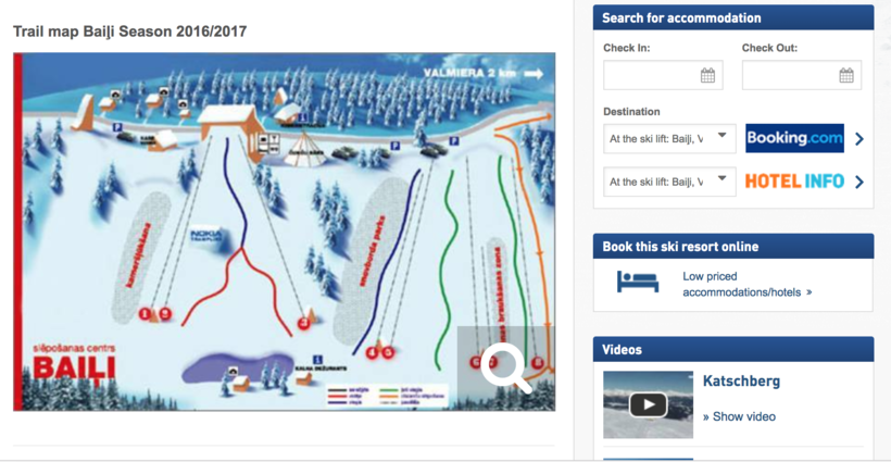 В Баили вы найдёте холмы высотой от 46 до 67 метров, а общая протяжённость трасс составляет 0.8 км, из которых простыми считаются 600 метров, а остальные 200 - средней сложности. Вход для взрослых стоит 12 евро, для детей - 10 евро. На вершины вас доставят 8 ски-лифтов, все бугельные. Есть кафе, бар и парковка, можно снять домик на склоне. С другой стороны, курорт находится всего в 2 км от крупного города Валмиера, где вы без труда найдёте гостиницу или апартаменты.
