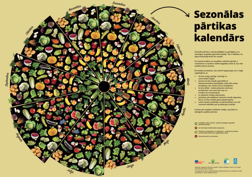 На фото ниже - сезонный календарь сбора урожая овощей, фруктов и ягод в этой прибалтийской стране. Также указано, когда можно собирать грибы и дикие ягоды. Кстати, многие жители Латвии занимаются собирательством на территории национальных парков и продают ягоды и грибы не только туристам, но и различным кафе и ресторанам.