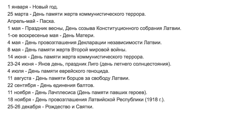 В отличие от россиян, латвийцы не отдыхают десять дней в начале нового года. Они отмечают Рождество и Святки 25-26 декабря, как и положено католикам и лютеранам. Официальные выходные в этот период длятся с 23го по 26ое декабря. В декабре отдыхают 30го и 31го, а единственным январским нерабочим днём является 1 число. Поэтому вас ждут работающая инфраструктура и активное уличное движение =)