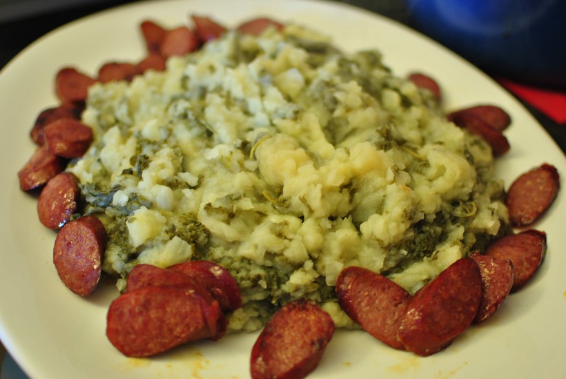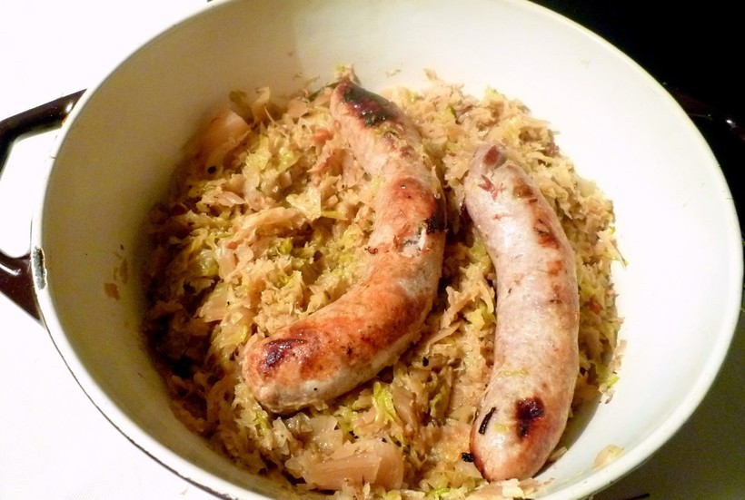 Gestoofde kool met gerookte worst - аналог немецкой тушёной капусты с колбаской. Капуста может быть любой, а сосиска - обязательно копчёная.