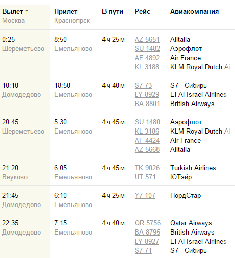 Из Москвы в Красноярск в наличии больше рейсов, здесь курсирует шесть самолетов, большинство из которых улетает вечером. Время в пути - почти пять часов.