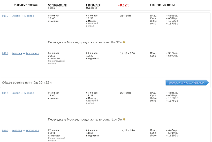 Ниже приведена информация о том, сколько часов вам потребуется, чтобы добраться от Анапы до Мурманска, а также приведена примерная стоимость проезда (средняя цена билета) на том или ином виде транспорта.