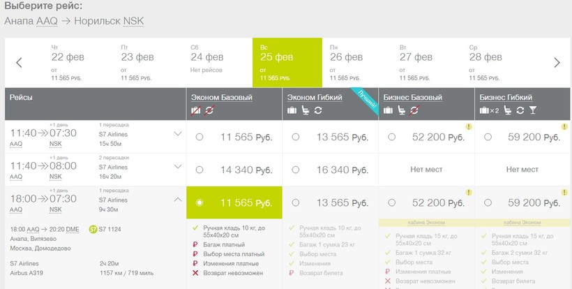 Авиакомпания S7 Airlines предлагает вот такие варианты: