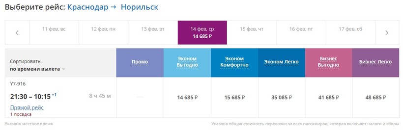 Из Краснодара, который находится, вроде бы, недалеко, летает рейс авиакомпании Нордстар в Норильск с посадкой в Новосибирске. Вроде бы и хорошо, сели да полетели, но на самом деле получается долго. Сперва несколько часов нужно, чтобы добраться в Краснодар на автобусе или поезде, затем переезд по городу в аэропорт, далее сам перелет, который из-за часовой остановки в Новосибирске длится 9 часов. В общем, ничего хорошего.