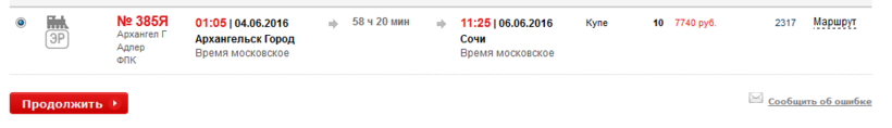 В общей сложности стоимость проезда из Архангельска в Сочи обойдется Вам в районе 7 000 рублей. Есть один нюанс. Вы сможете выбрать прямой поезд и поезд с пересадками, маршрут с пересадками стоит дороже, но прямые поезда ходят довольно редко, поэтому покупайте билеты заранее, их очень быстро разбирают. Ниже на скриншоте Вы можете видеть расписание и стоимость билетов на прямой поезд.