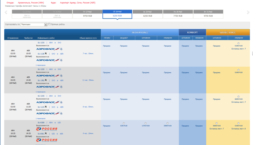Не взяв билет заранее, я вынуждена была отдать 14 000 рублей за билет комфорт класса. Самые недорогие билеты – это билеты эконом класса, билеты по направлению Архангельск – Сочи этого класса стоили 6250 рублей, но на момент покупки их не было, а билеты бизнес класса стоили 51 000 рублей и выше. Покупайте билеты хотя бы за две или три недели, тогда у Вас будет выбор, Вы сможете подобрать удобный для Вас рейс и выбрать нормальные билеты. Цены, указанные здесь приблизительные, во всех авиакомпаниях свои цены. Стоимость варьируется в зависимости от времени отправления самолёта, от дня недели в которое отправляется самолёт.