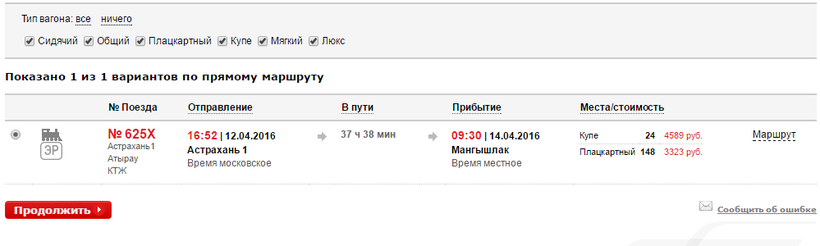 Ехать нужно на поезде 625Х почти 38 часов. Выезжает поезд в 16:52, а прибывает пункт назначения через день в 09:30.
