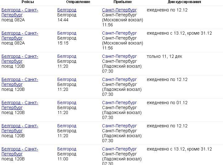 От железнодорожного вокзала Белгорода каждый день уходят поезда в Санкт-Петербург (прибывают к Московскому и Ладожскому вокзалу). Это удобно и намного дешевле, чем самолетом, но намного дольше – более 20 часов в пути. Рейсы дневные, в Санкт-Петербург прибытие утром или днем. Расписание лучше заранее уточнить на сайте РЖД.