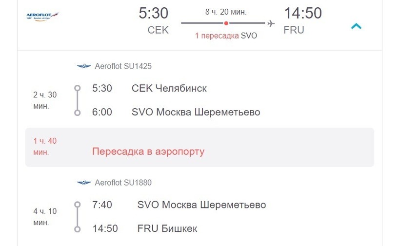 Самолеты, которые выполняют гражданские перевозки по этому маршруту, принадлежат компании Aeroflot. Аэропорт пересадки в Москве — Шереметьево. Дорога до Бишкека — 8 часов и 20 минут. Конечно же, это без учета времени, которое вам понадобится, чтобы добраться до воздушной гавани и пройти паспортный контроль, досмотр багажа и т.д.