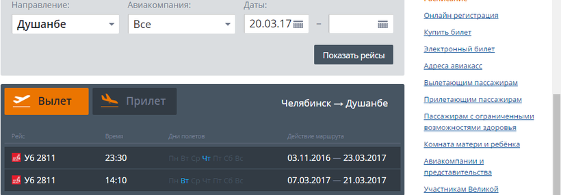 В Челябинске, как и в Худжанде, есть свой аэропорт, однако долететь напрямую можно только летом чартерными рейсами. В остальное же время дорога только в Душанбе, а от него уже добираться любым способом в конечный пункт. Я ниже прикреплю сезонное расписание рейсов: