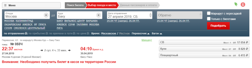 Если вы фанат поездной романтики, то этот вариант точно для вас. Меня как-то не прельщало ехать больше суток. Да и ходит поезд всего раз в неделю. Он отправляется с Курского вокзала Москвы в 22:37, а приезжает на вокзал «Баку Пассажирский» в 4 утра 10 минут. Ходит поезд по субботам.