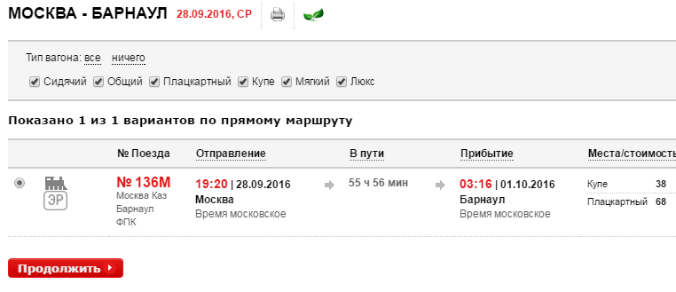 Несмотря на то, что поезд ходит ежедневно, он отправляется лишь раз в день. По данному расписанию Казанского вокзала, видно, что поезда в Барнаул отправляется завтра в 03:16 ночи.