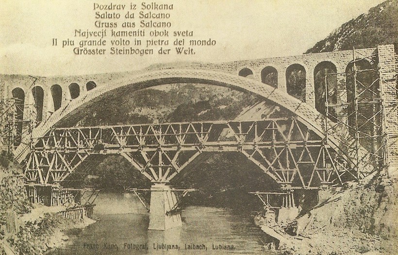 Общая протяженность этого действующего железнодорожного моста составляет 219,7 метров с аркой длинной 85 метров через реку Соча . Это самый большой каменный мост среди построенных в мире мостов и состоит из 4 533 каменных блоков. Мост Солкан был построен венской строительной компанией Brüder Redlich und Berger между 1904 и 1905 годами и официально лично открыт австрийским наследником Францем Фердинандом 19 июля 1906 года.