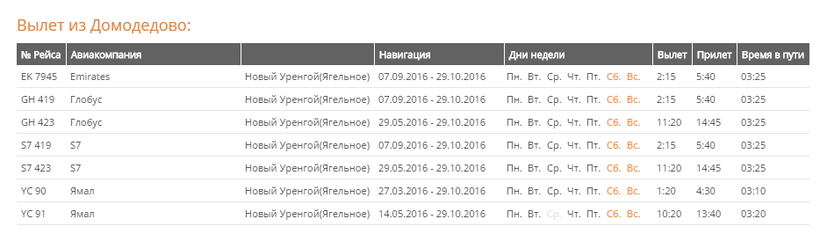 Вы можете вылететь из любого аэропорта Москвы, так как рейсы до Нового Уренгоя они выполняют все. В небе вы проведет не больше 3,5 часов, это в несколько раз меньше, чем поездом. Перевозку до Нового Уренгоя выполняют компании: «Аэрофлот», «Ямал», « Глобус», «S7» и т. д. Ежедневно выполняется 10 рейсов, за пример давайте возьмем Домодедово. Как видно, на завтра есть семь рейсов на разное время, вы можете выбирать авиакомпанию и удобное дня вас время.