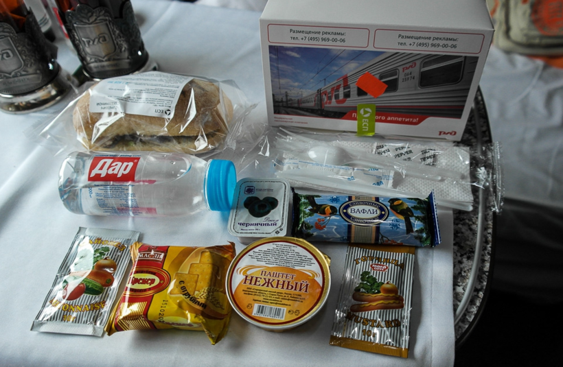 Каждому пассажиру полагается сухпаек (йогурт, печенье, сэндвич, паштет, вафли и вода), а также горячий обед.