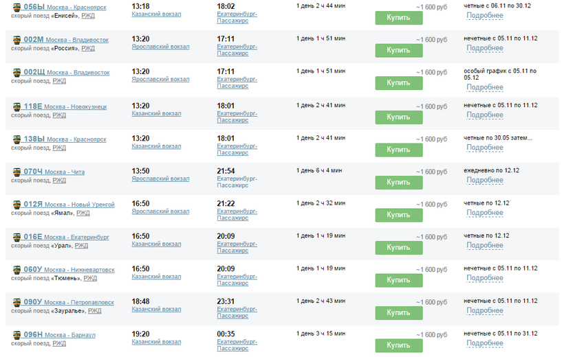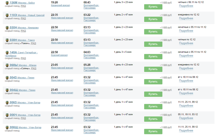 Начиная с часа ночи почти каждые 30-40 минут происходят отправления поездов из Москвы в Екатеринбург.