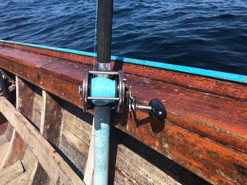 Дойдя до места, капитан разматывает оба спиннинга и насаживает живца на внушительного размера крючки. Одного живца отпускает просто на леске, второму привязывает пенопластовый поплавок, оставив примерно 3 метра лески (т.е глубже живец не нырнёт). Ставим спиннинги в подставки, предварительно ослабив фрикцион, отходим метров на 50-70 и ждём..