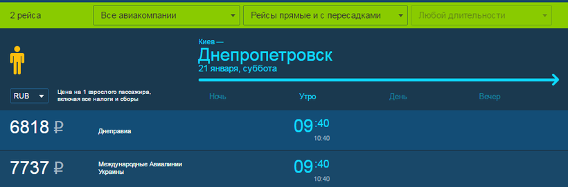 Ну и остается сесть на самолет до Днепропетровска и провести в небе еще один час. Хочу подметить, что перелет с Киева до конечного пункта самый дорогой. На завтра тоже есть 2 рейса от разных авиакомпаний, которые отправляются в одно и то же время − 09:40.