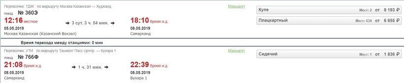Этот вариант я могу посоветовать только тем, кто по каким-то причинам не хочет лететь на самолете. Прямые поезда из Москвы в Бухару не ходят, нужно ехать с пересадкой в Самарканде. Отправление с Казанского вокзала Москвы.