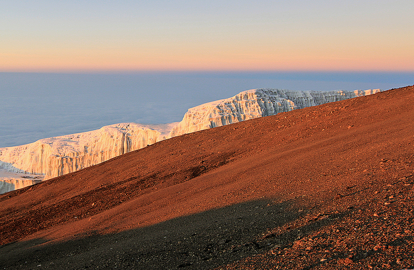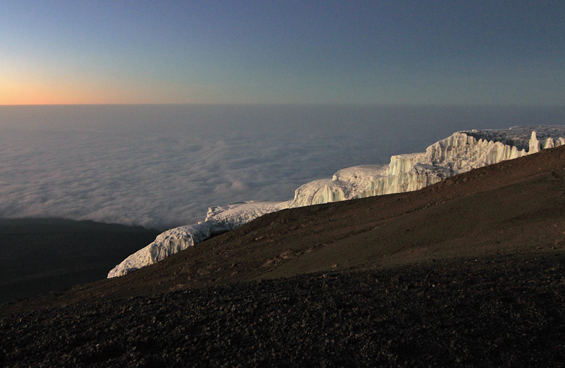 - Встретить рассвет на вершине Африки. Это один из тех моментов, ради которых стоит жить. Увидеть своими глазами, как первые лучи солнца, показавшиеся из за моря облаков, падают на ледники и окрашивают их сначала в ярко-алый, затем в оранжевый, а потом в желтый цвет. Лед буквально светится изнутри. Все это происходит за каких-то 15-20 минут, потом все приобретает привычные окраски и очертания.