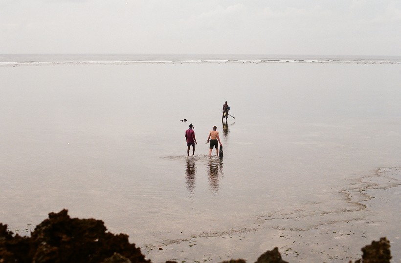 Итак, как происходит такая охота. Сначала надо пешком миновать приливно-отливную зону. Глубина примерно по колено, под ногами очень острые и скользкие камни. Поэтому идти обязательно в тапках. Так как вдоль рифа присутствует нехилое течение, его нужно учитывать и подняться значительно выше, иначе унесет далеко в океан.