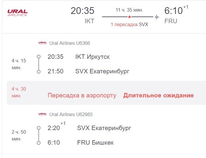 В дороге проведете одиннадцать с половиной часов. Оба рейса выполняет компания Ural Airlines.