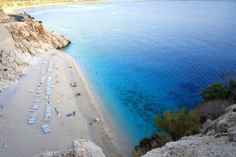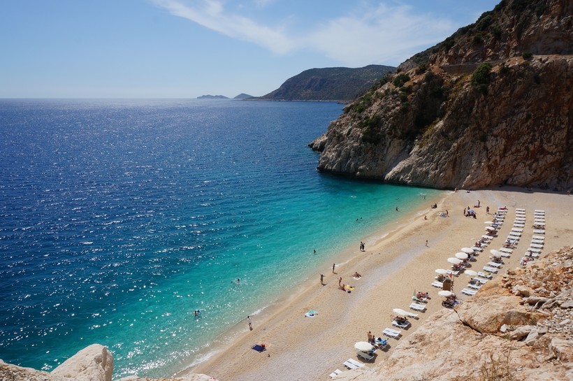 - Капуташ. Еще один безумно красивый пляж Турции находится в районе курортов Каш и Калкан, а точнее — между двумя этими городками. Пляж небольшой, но весьма живописный, в окружении скал, галька здесь перемешивается с золотистым песком, вода в море не кристальная, но безумно красивая по цвету.