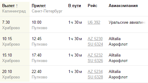 Расписание авиа рейсов по направлению Калининград - Санкт-Петербург