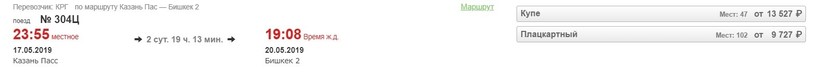 Прямой поезд до Бишкека ходит один раз в пять суток. Отправляется он из Казани ночью. В дороге нужно провести почти трое суток.
