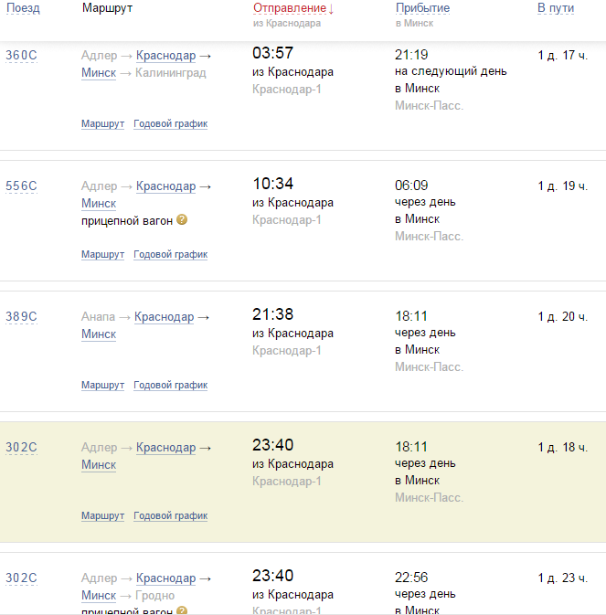 Все поезда отправляются со станции Краснодар-1 и прибывают на станцию Минск - Пассажирский.