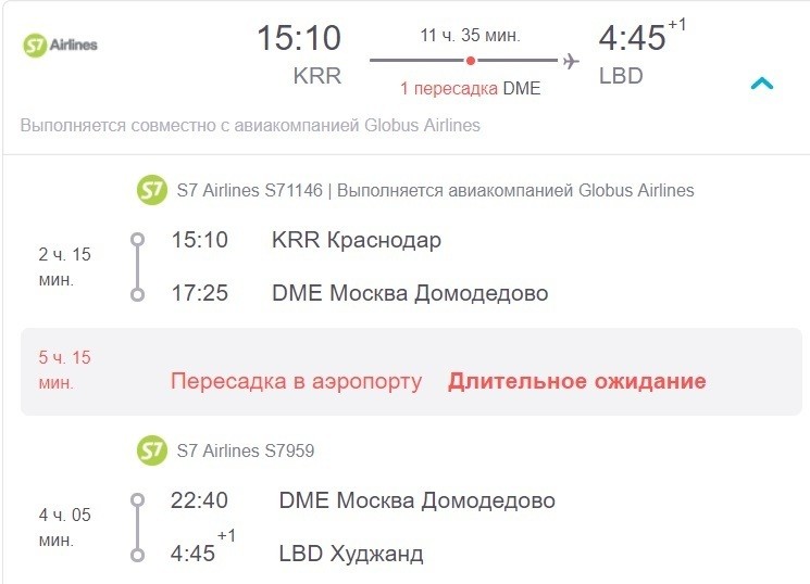 Рейс выполняет S7 Airlines совместно с Globus Airlines (она входит в группу компаний S7).