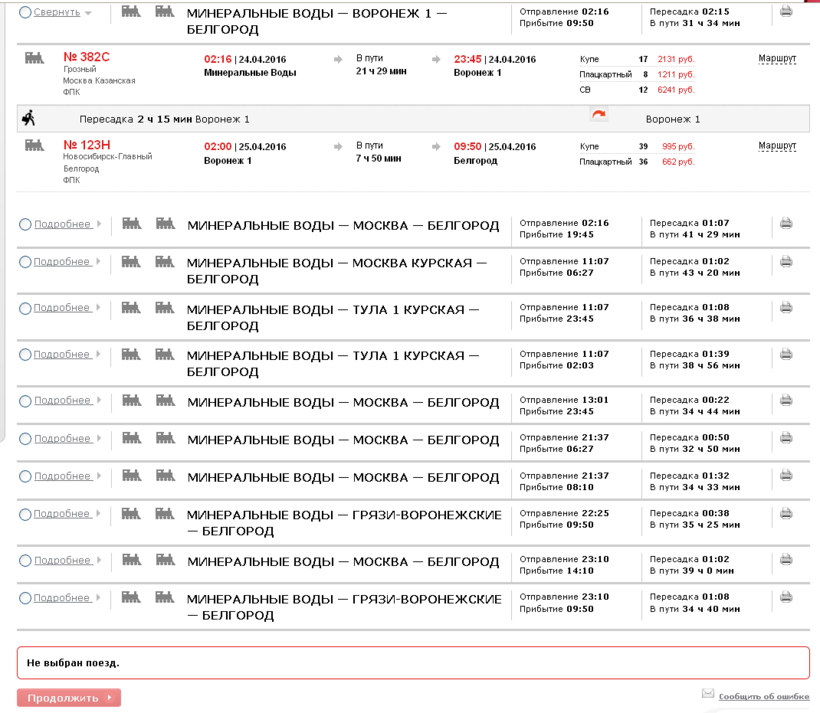 Стоимость проезда на поезде, идущем из Минеральных вод до Воронежа в плацкартном вагоне 1211 рублей, стоимость проезда в купейном вагоне 2131 рубль, а стоимость проезда на этом поезде в вагоне СВ - 6241 рубль, мы выбрали плацкартный вагон. Стоимость проезда на поезде, идущем из Воронежа до Белгорода в плацкартном вагоне 662 рубля, а в купейном вагоне стоимость билета 995 рублей, здесь мы тоже выбрали плацкартный вагон. В общей сложности на билет я потратила почти 1900 рублей.