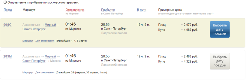 Ниже приведена информация о том, сколько часов вам потребуется, чтобы добраться от Мирного до Санкт-Петербурга, а также приведена примерная стоимость проезда (средняя цена билета) на том или ином виде транспорта.