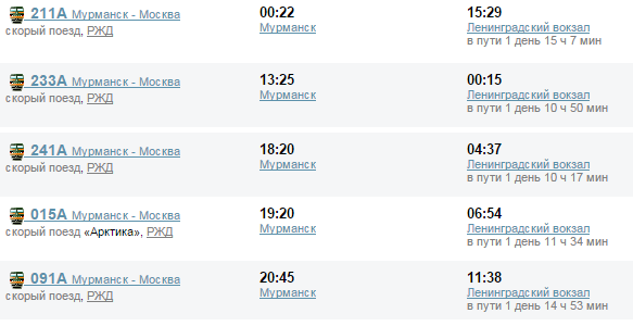 Скоростные и комфортабельные поезда по данному маршруту отправляются обычно после обеда и до самой ночи. Все они отходят с главного железнодорожного вокзала Мурманска и прибывают на Ленинградский вокзал в столицу.