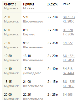 Все они улетают из главного аэропорта Мурманска и прибывают в три столичных аэропорта - Внуково, Домодедово, Шереметьево. Эту информацию уточняйте всегда при покупке билетов.