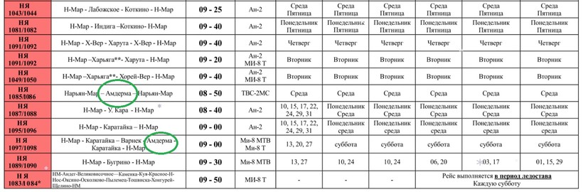 Помимо этого рейса есть еще несколько из Нарьян-Мара. Это самолет Ан-24, который также летает по субботам, но другим субботам. :) Здесь есть особенности перелета: рейсы не выполняются в зимнее время, с собой провезти бесплатно можно только 10 кг груза. В эти же субботы летают вертолеты МИ-8, рейсы выполняются круглый год, бесплатно можно провезти 20 кг багажа. Еще по средам летает кукурузник ТВС-2МС. Это все рейсы Нарьян-Марского объединенного авиаотряда.