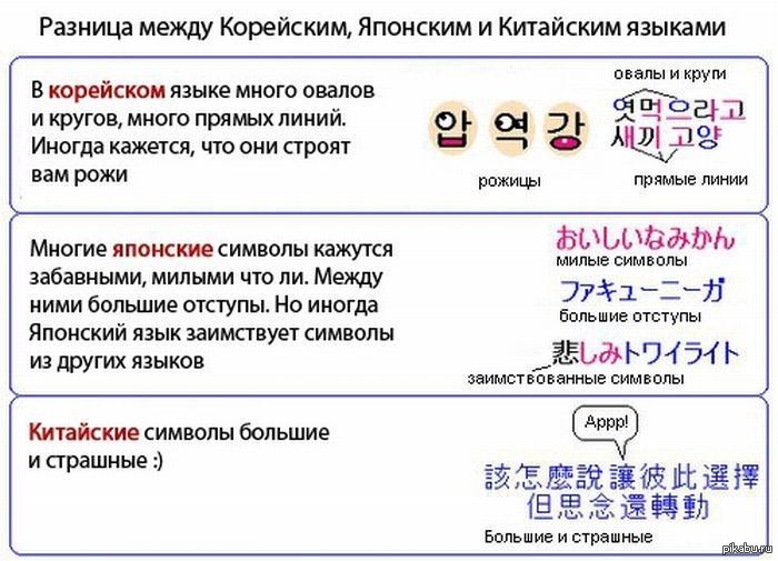 Первое что я бы хотела сказать о корейском языке, это то как его отличать от китайского или, например японского. Стоит сказать, что в корейском много кругов и овалов, в отличие от остальных вышеперечисленных. Чтобы посмотреть наглядно прикладываю фото.
