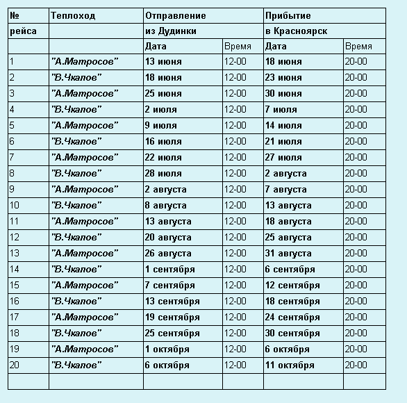 - На теплоход и поезд - в кассах Центрального Агентства Воздушных Сообщений (в Красноярске, Норильске и Дудинке).