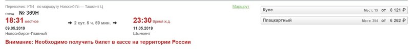 Цена билета на поезд до Шымкента — от 6260 рублей.
