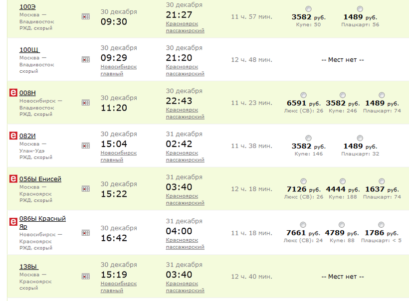 Между Новосибирском и Красноярском постоянно курсируют поезда. Много проходящих поездов, которые отправляются из Новосибирска практически каждый час. Есть плацкартные вагоны, вагоны-купе и люкс.
