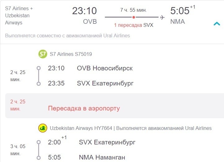 В дороге проведете восемь часов. Рейсы выполняют компании: S7 Airlines и Uzbekistan Airways совместно с Ural Airlines. Аэропорт Намангана представляет из себя двухэтажный небольшой терминал.