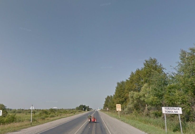 Здесь тоже о знаках не заботятся. Впрочем, трасса, идущая «параллельно границе», неоднократно ее пересекает. Пейзажи – красивые, но наше небо «тяжелое». Понятно, почему хочется на юг? Минуем Муген, Туртас… вот и Тобольск, заявляющий скромно о себе.